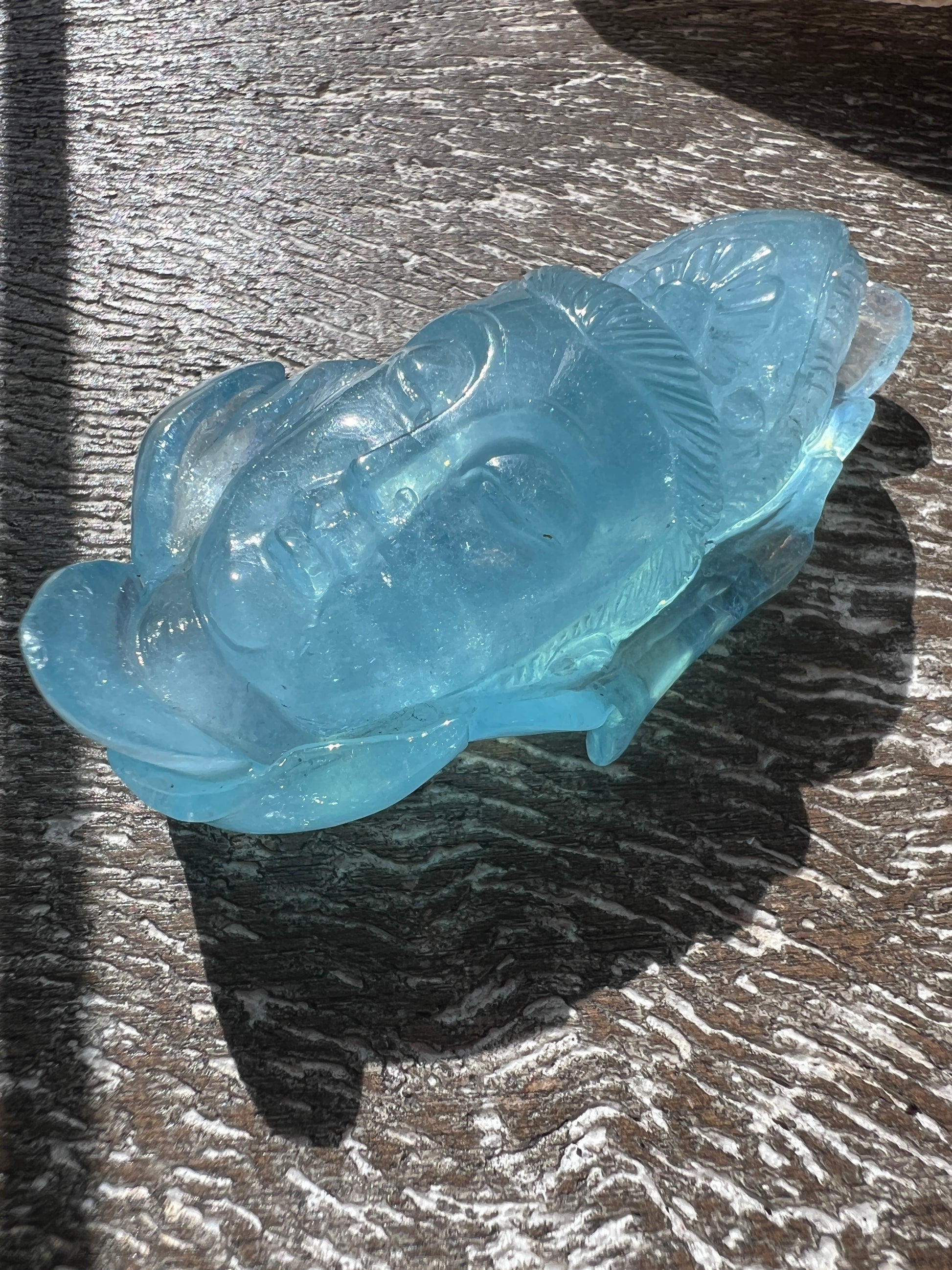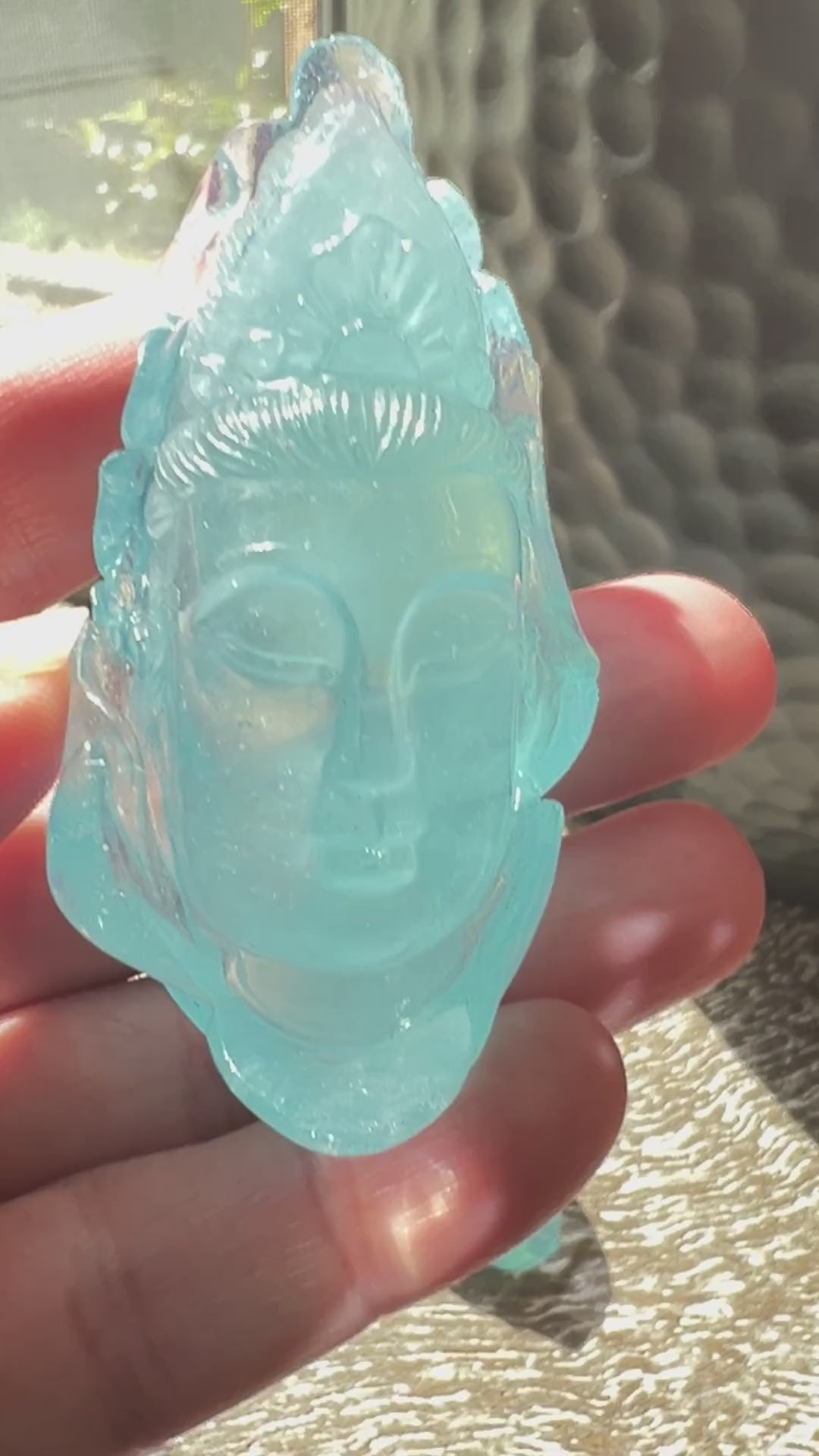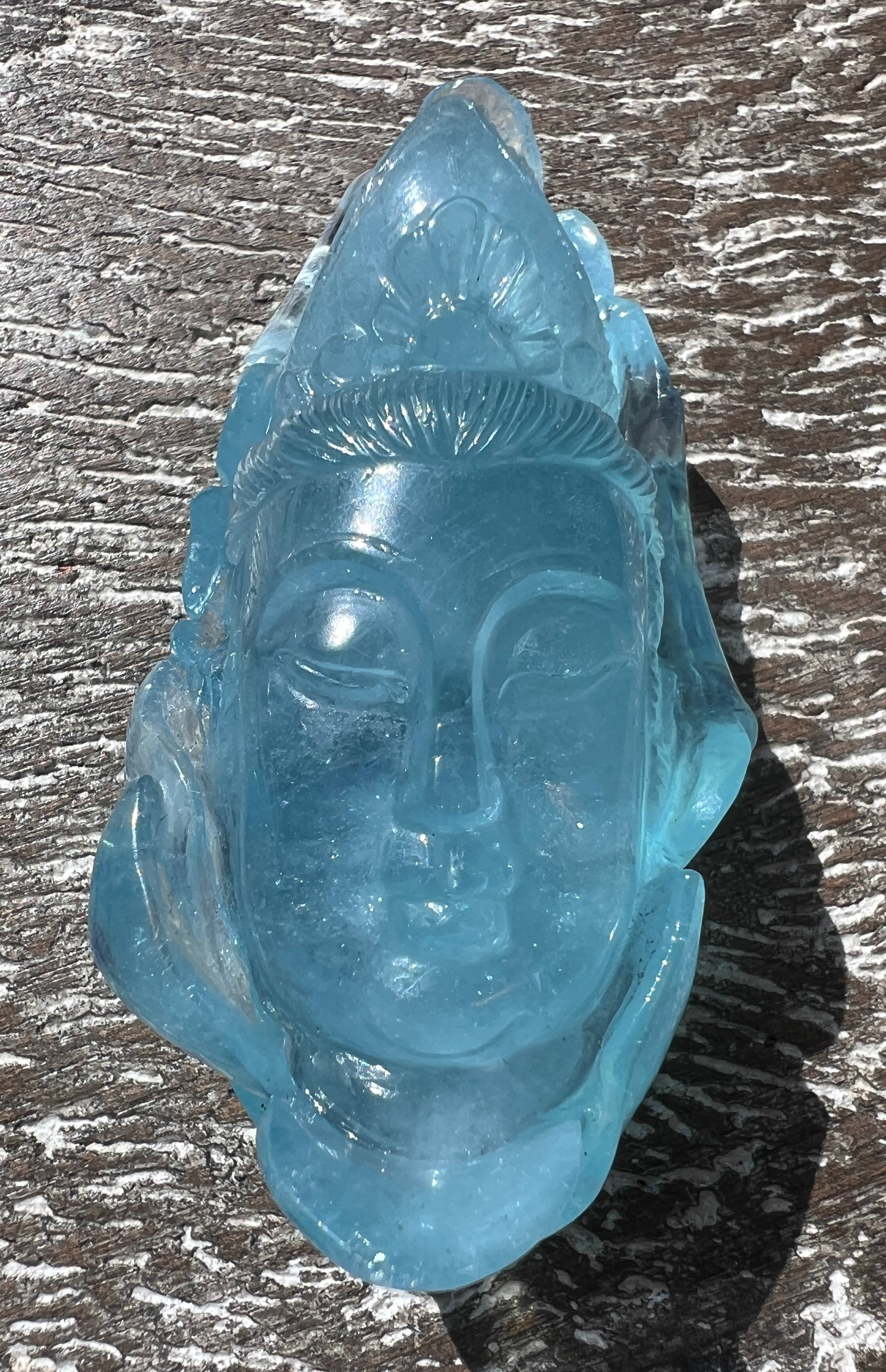 This stunning piece, 73g, crafted by a master carver in Aquamarine captures the elegance and beauty of the Chinese Goddess Guanyin. It can be displayed as an objet d'or art, or there is a very small hole at the top which can be used to fashion a necklace, for those who wish to wear a very large statement piece, or to hang it as a special home decor jewel.