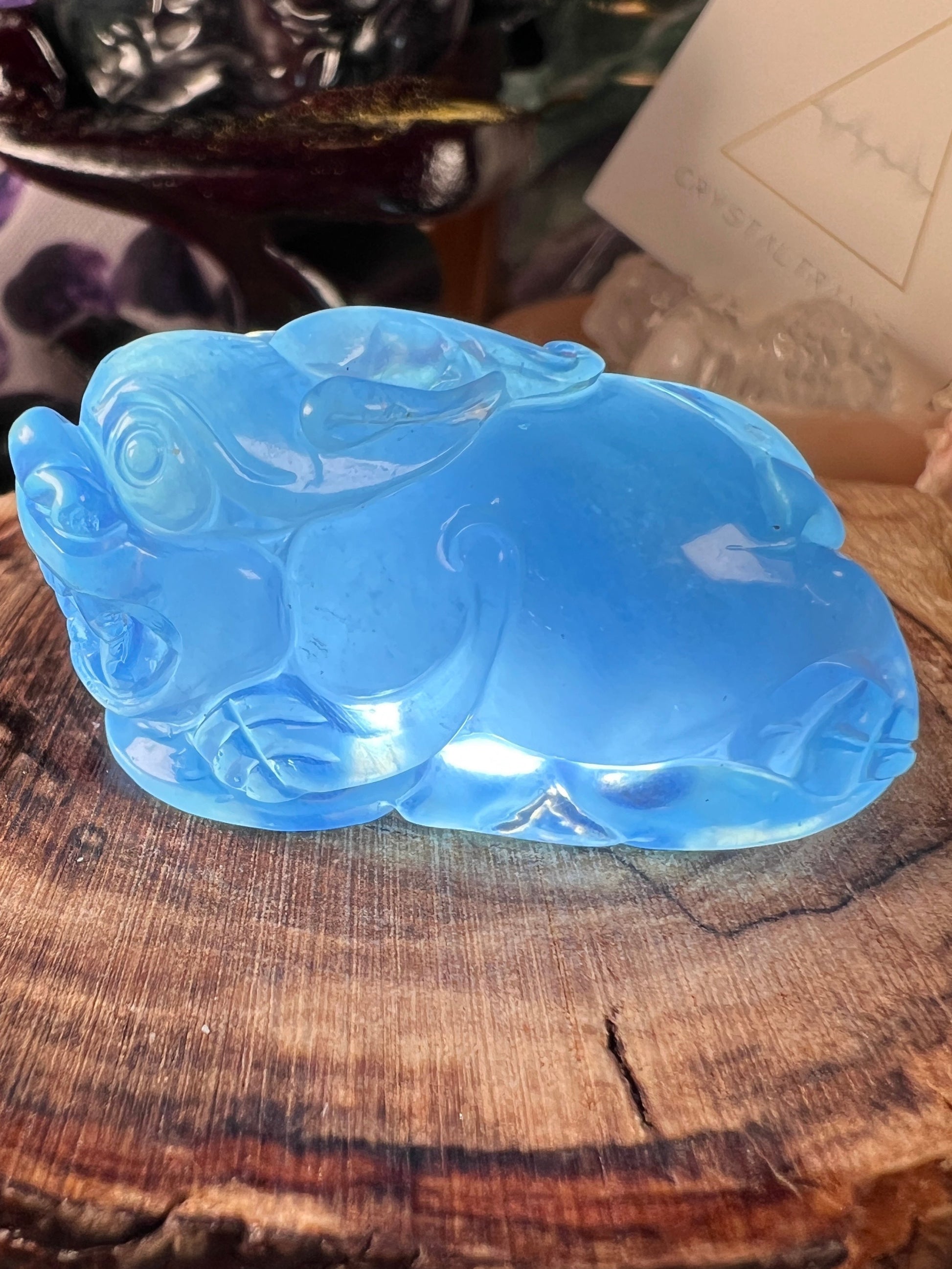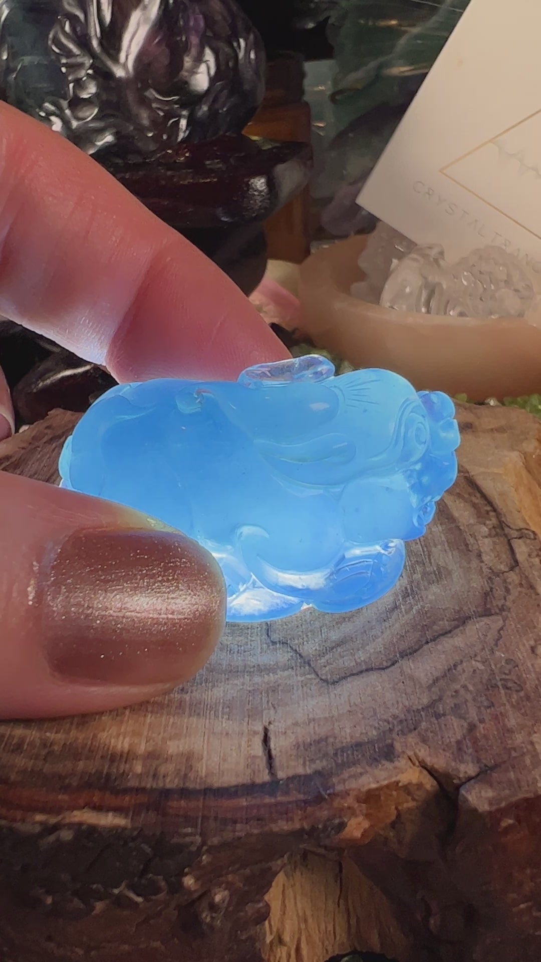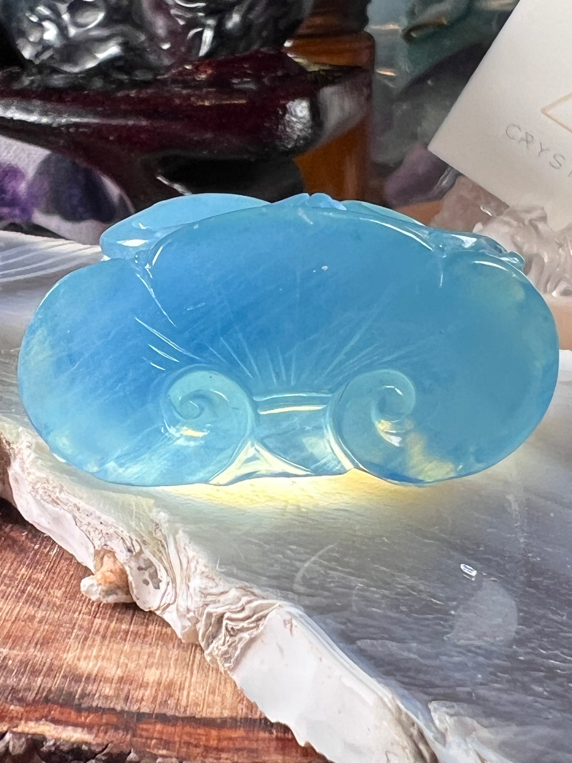 Aquamarine you see in chain-store jewelry is often gently heated to remove its natural green or yellow cast and create an even sky-blue. Natural, untreated pieces usually show pockets of darker blue, soft yellow, or sea-green zoning—exactly the variations you’ll often find in our carvings. Those subtle shifts are visual cues the crystal’s story hasn’t been altered.