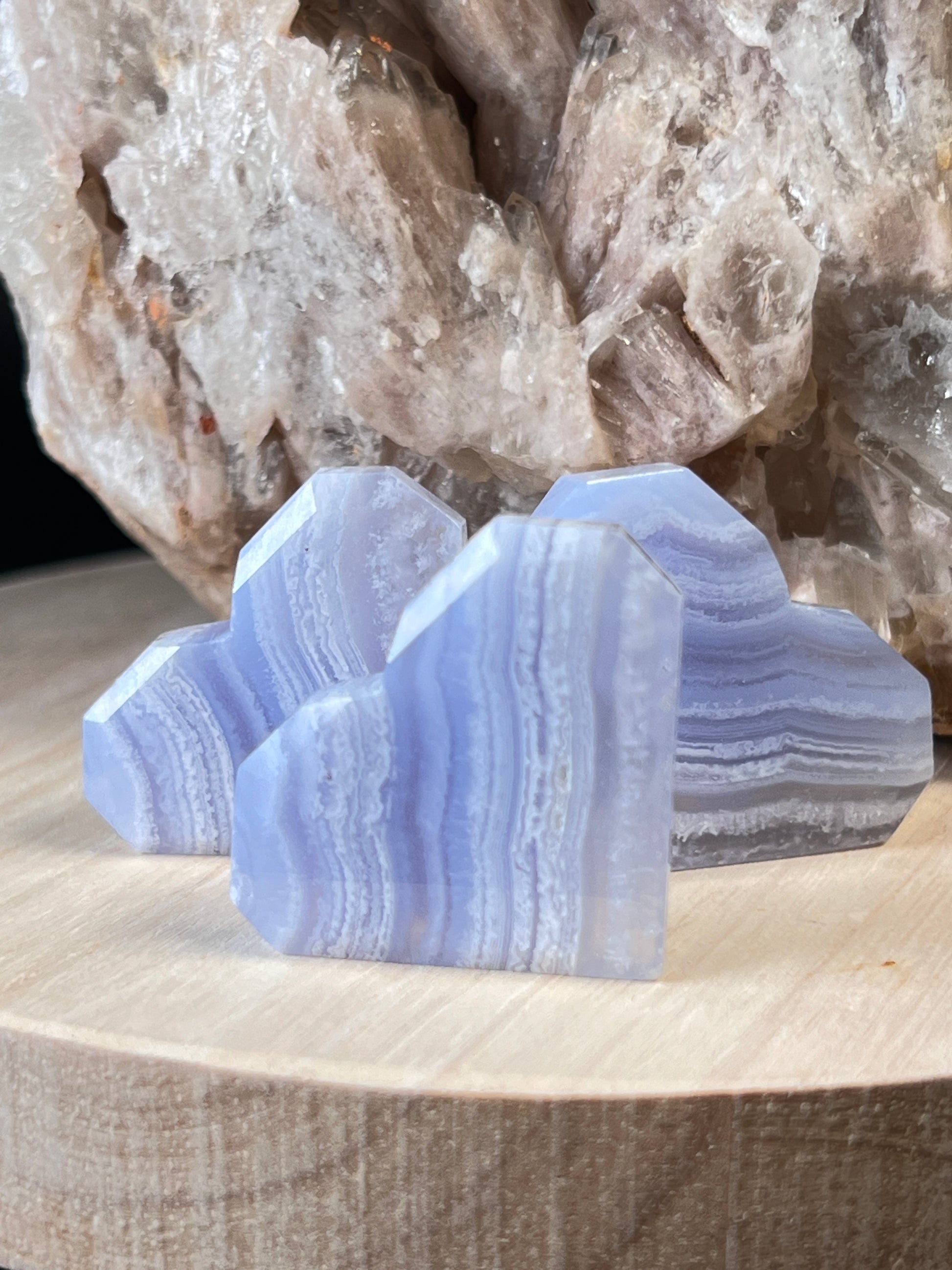 Blue Lace Agate - a gentle and calming stone, known for its soft, sky-blue color accented by delicate white banding. It is often associated with peaceful communication, helping to ease tension and promote clarity in both thought and expression. Believed to soothe emotions and reduce stress, Blue Lace Agate is an excellent choice for those seeking balance and harmony in their daily lives. This beautiful stone is primarily sourced from South Africa, where it forms in volcanic rock layers.