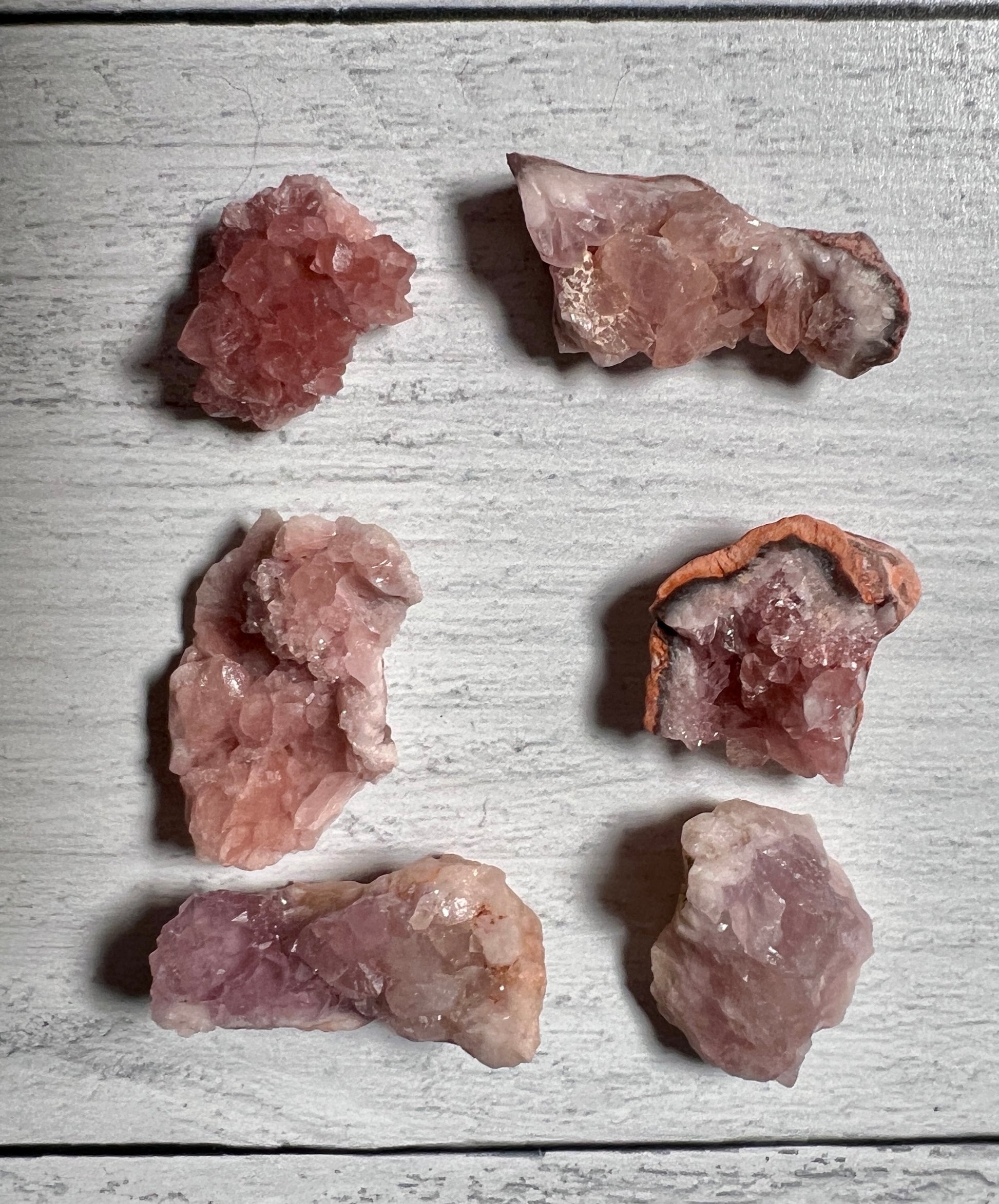Pink Amethyst can be used similary to standard purple amethyst, for the crown chakra, for example. However this more rare version from Argentina has the added component of Hematite, and can be used for love, and working on the heart chakra. These gorgeous pieces are lovely. You will receive simliar pieces in your set.