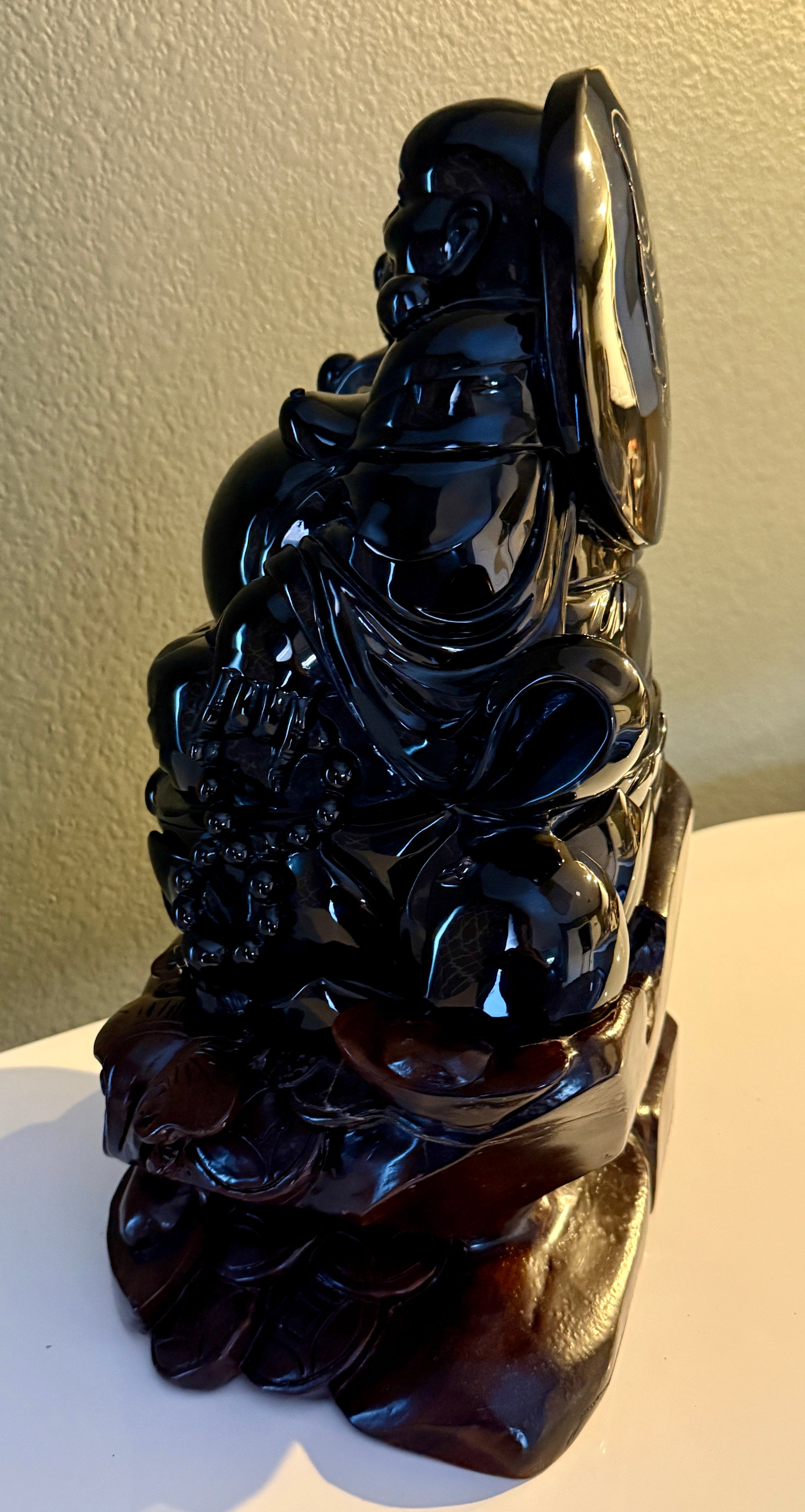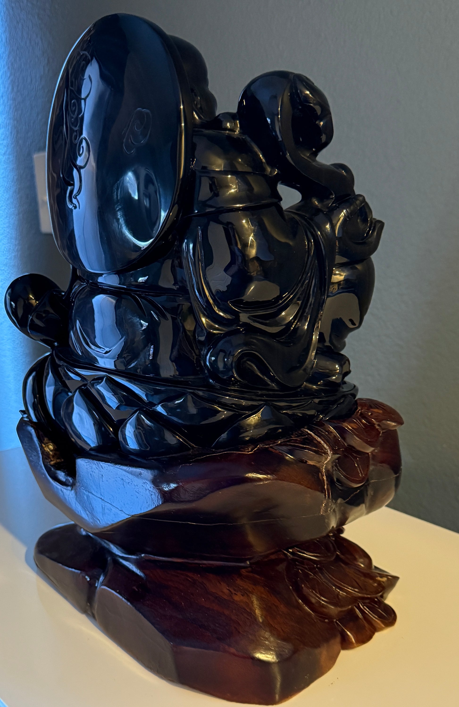 Equally striking is the treatment of the robe. Rather than appearing static or rigid, the garment moves with natural rhythm, its folds cascading with a sense of motion that feels almost fluid. The sculptor has achieved the rare ability to suggest softness and flow in a material as unforgiving as obsidian. This dynamic drapery elevates the piece beyond form and into expression, signaling the pinnacle of stone-carving mastery.